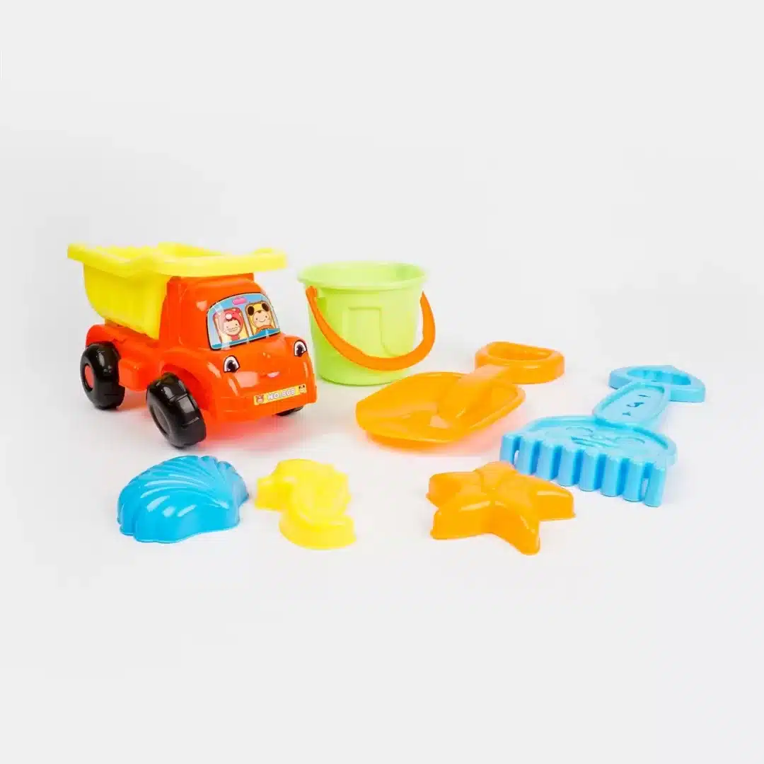 Contiene (6) piezas: una pala, un rastrillo, un balde, 3 moldes.