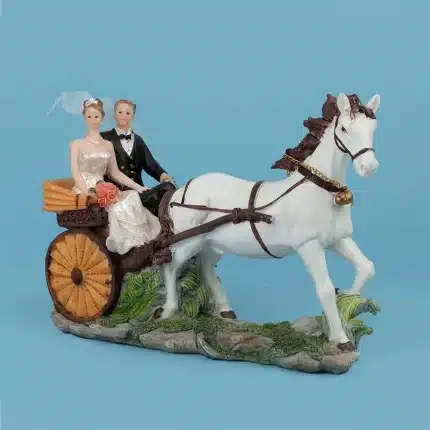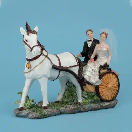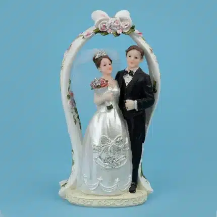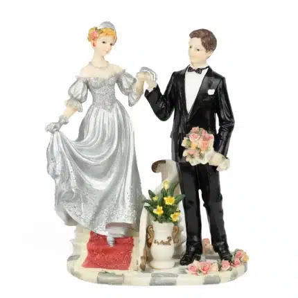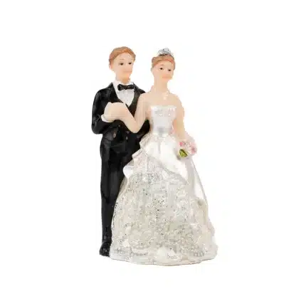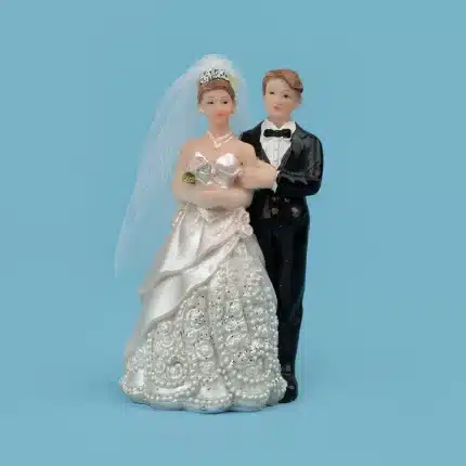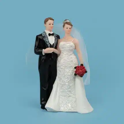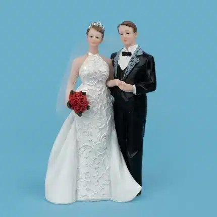 Pareja de novios elaborados en poliresinas. Modelo: Novia vestido con cuello tortuga. Mide 15 cm de alto.